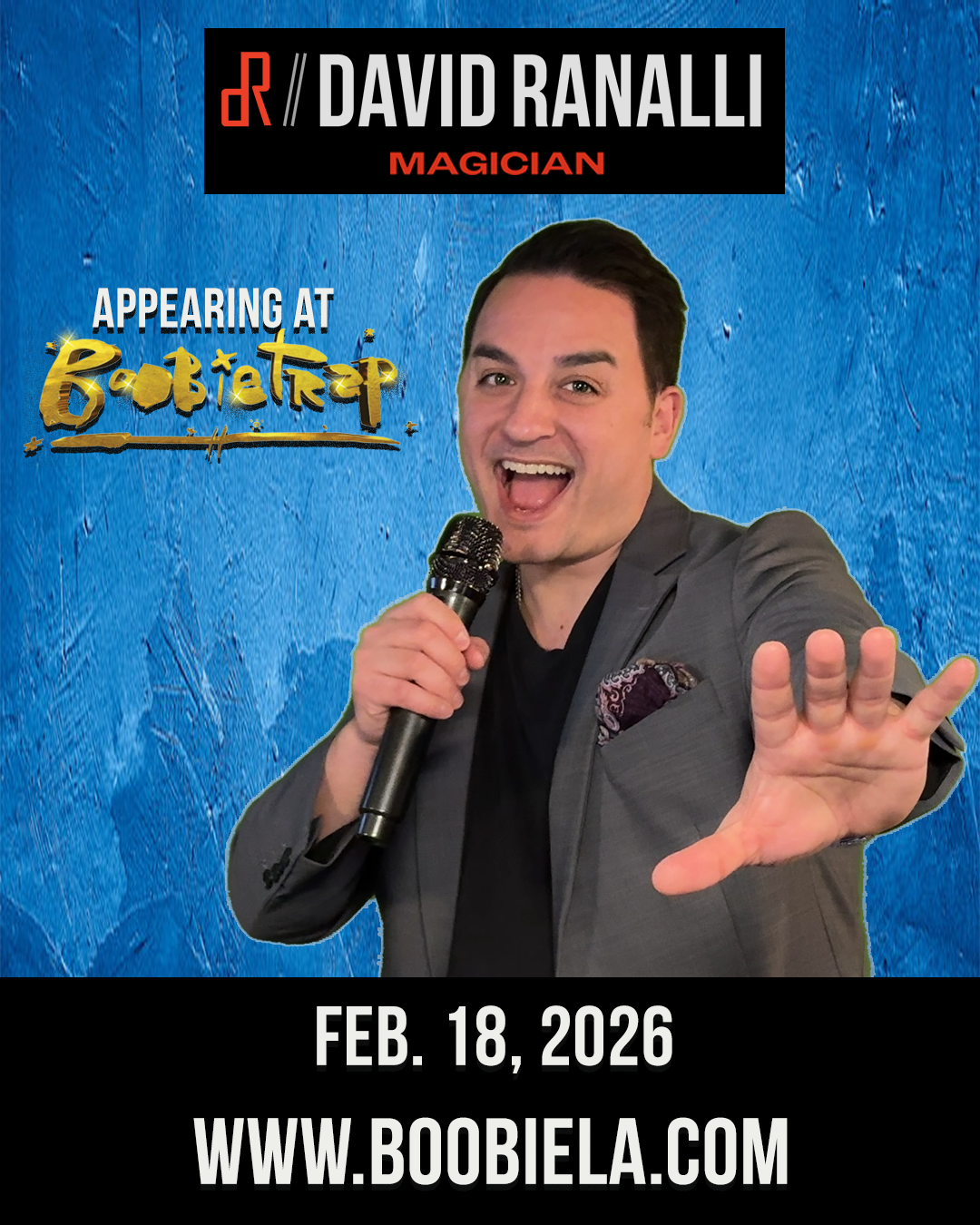 David Ranalli is appearing at Boobietrap LA on Febuary 18, 2026. THE MAGIC OF DAVID RANALLI is a one-of-a-kind magic show that will take you into the world of mystery, wonder, and surprise. AGES 10 & OLDER DOORS OPEN at 11:30am and SHOW STARTS at 1:00pm $25 FOOD and BEVERAGE Minimum per guest Cabaret Seating - All seats at the table are for sale. Buying one [...] THE MAGIC OF DAVID RANALLI is a one-of-a-kind magic show that will take you into the world of mystery, wonder, and surprise. AGES 10 & OLDER DOORS OPEN at 5:30pm and SHOW STARTS at 7:30pm $25 FOOD and BEVERAGE Minimum per guest Cabaret Seating - All seats at the table are for sale. Buying one [...] THE MAGIC OF DAVID RANALLI is a one-of-a-kind magic show that will take you into the world of mystery, wonder, and surprise. AGES 10 & OLDER DOORS OPEN at 5:30pm and SHOW STARTS at 7:30pm $25 FOOD and BEVERAGE Minimum per guest Cabaret Seating - All seats at the table are for sale. Buying one [...]Events